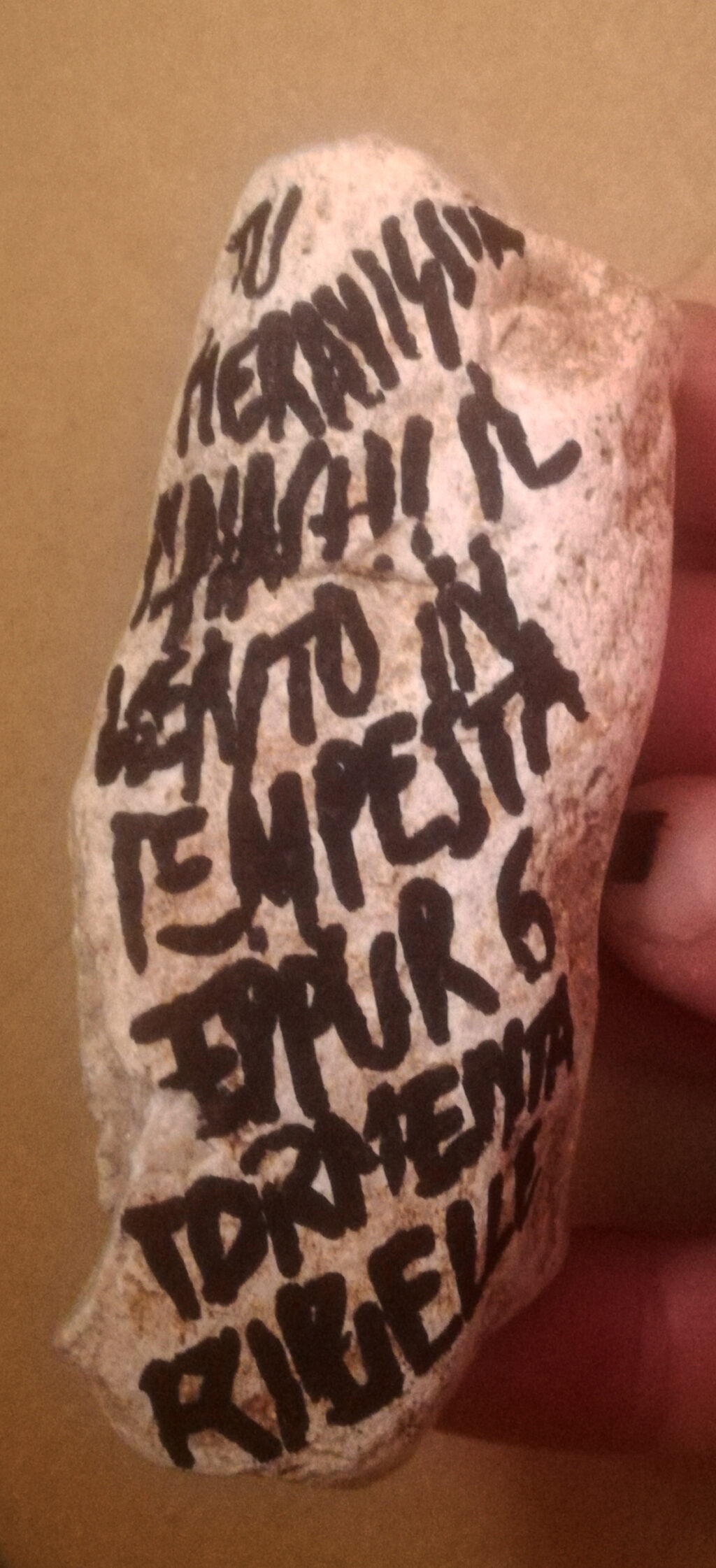 TU MERAVIGLIA PLACHI IL VENTO IN TEMPESTA EPPUR SEI TORMENTA RIBELLE”.